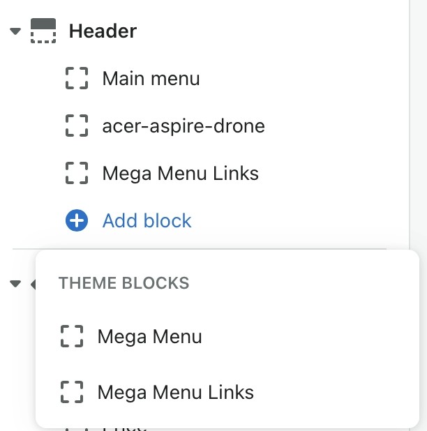 For mega menu links you need to create a multi level menu and then assign it to header section block 'megamenu links' as can be seen here,